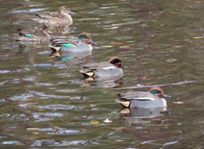 コガモ(手前3羽がオス、奥の2羽がメス)