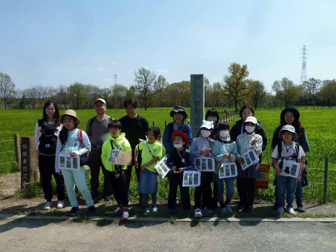 彩湖へ行く途中、第一指定地石碑前で記念写真