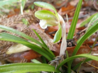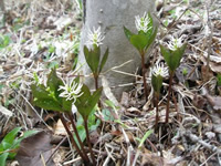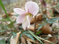 日当たりのよい尾根筋には、スミレのなかまが多く見られました。観察できたのは、タチツボスミレ、アケボノスミレ、ニオイタチツボスミレ、エイザンスミレ、ヒナスミレ、ナガバノスミレサイシン、ツボスミレ、ヒメスミレ、アオイスミレ等々…。 それぞれが色とりどりの花弁の衣装と個性豊かな葉を身にまとって、さながら春の新作ファッションショーのようでした。