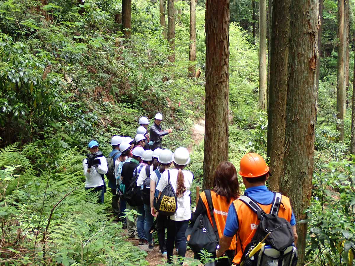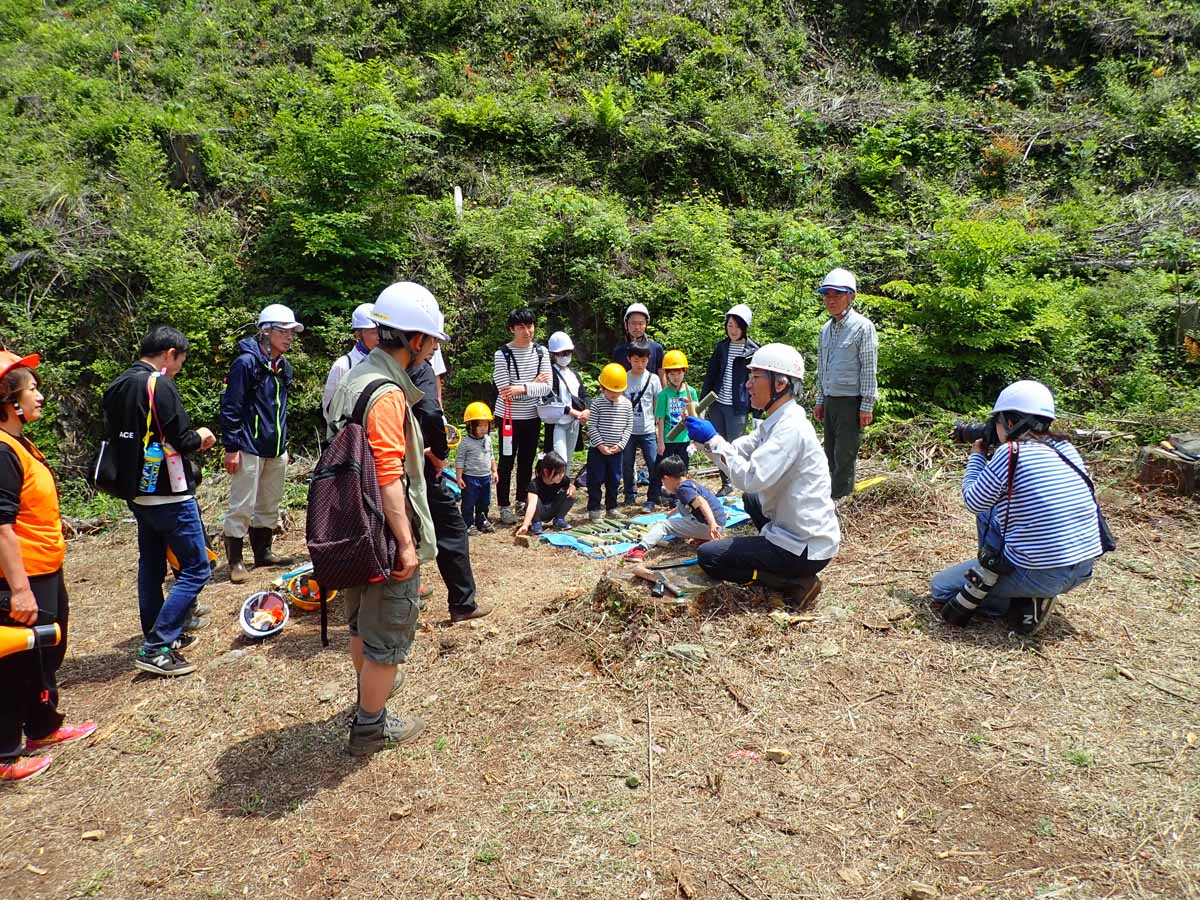 日本の一流企業ではCSR(社会的責任)活動として環境対策活動が行われていて、パナソニックも森林保護活動として植樹を和歌山県「田辺龍神・ながきの森」で9年前から実施しています。埼玉県「毛呂山・ながきの森」はそれに続いて始められたもので、今年は5月11日にパナソニックの社員とその家族140名の参加で実施されました。植樹活動だけの3グループと植樹活動+森の観察会に参加する3グループに分かれて、植樹活動は埼玉県農林公社の職員が担当し、当会は森の観察会の案内を担当しました。その中の若い人主体の1グループは高杉さんが引率し、森の観察をしながら宿谷の滝まで急ぎ足で往復しました。シダの話が聞けて、滝が見られて良かったと好評でした。他の親子連れ主体の2グループは、「ながきの森」周辺の森の観察を桂さんが引率し、その後用意していた青竹の筒を使って、桂さん、河野さん、辰尾が竹の輪通し(ケン玉のような遊び方)を作る指導をしました。子供がマジックで印を付け、お父さんがノコやナタで印に沿って切り取る連携作業が上手に出来、お父さんの株がグンと上がりました。全体的にとても充実したイベントだったと感じました。