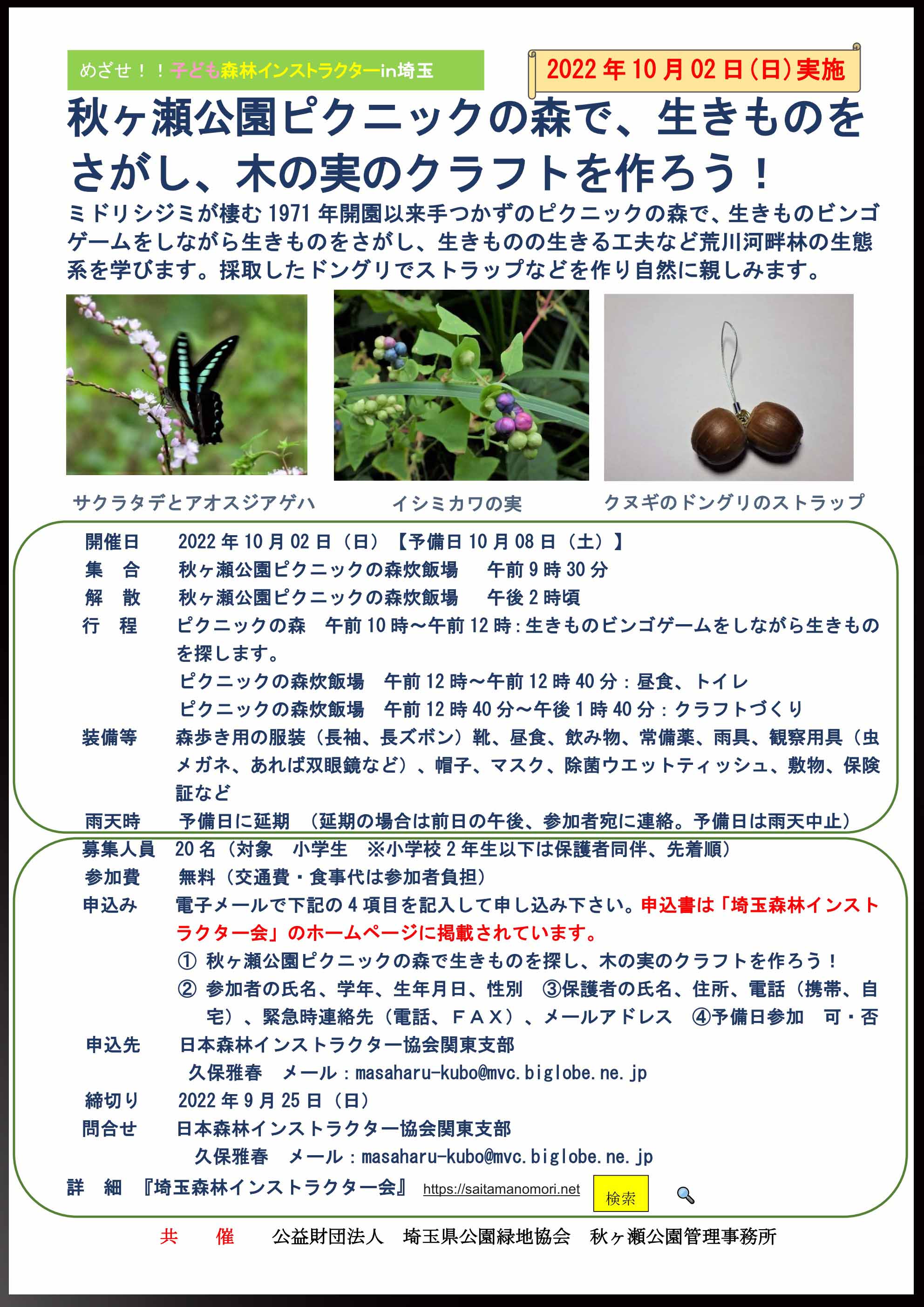 ②10月2日(日)秋ヶ瀬公園ピクニックの森で生き物を探し、木の実のクラフトを作ろう!