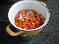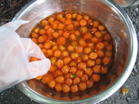 モミジイチゴを塩水につけてよく洗います |
