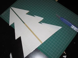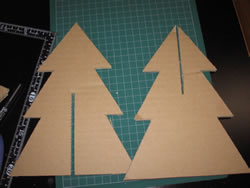 2枚のダンボールを組み合わせてツリーのベースに。そこに両面テープで素材を貼り付けて飾りを付けていきます。 |
