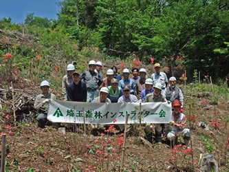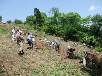 << 長瀞宝登山「ヤマツツジ再生の丘」2011 >> 2011年5月14日(土)ヤマツツジの植林 爽やかな青空の下、宝登山「ヤマツツジ再生の丘」にヤマツツジ100本を植えました。 インストラクター16名に長瀞町の町長や職員の方、そして雨宮植物園の方にも応援に駆けもつけていただきました。(豊福)