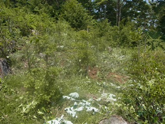 << 長瀞宝登山「ヤマツツジ再生の丘」2013 >> 2013年8月11日(日)下刈り作業 朝から晴天の「熱中症」注意報が出ている暑い日。現地は6月に第1回目の下刈りを実施していますが2カ月間で、元にも戻った状態。普段よりも休憩回数を増やし、水分補給をしながらの作業。ヤマツツジに巻きついた蔓切りに難渋しながらも、刈払機2台の投入が効果を発揮し、午前中に植栽地全体の下刈り作業が無事終了。ヤマツツジノ活着状況良好、上長成長も順調。 昼食時には、横山さん持参の冷水がとても美味しく、何よりの御馳走でした。(星野)