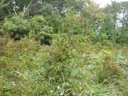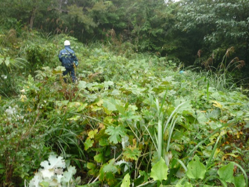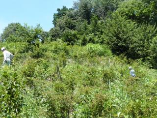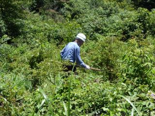 連休の中日、朝から小雨が降っている。前日、事務局の黛さんから、小雨模様ですが、後の日にちが無いので、当日現地に集合する旨の連絡がありました。天気予報では午後には雨も上がるとの事、朝6時に家を出て、ひたすら下道を長瀞に向かう。途中所々で雨が強く降っていたが、8時30分には集合場所についてしまった。平成21年5月16日に第1回の植樹が行われた。あれから6年、木もだいぶ大きくなった。 当日は6人が集合し車で現地に向かう。草が木々以上に伸びて見分けが付かないほどだった。8月に刈り残した、下の段から始める。さすがに草や灌木が多くててこずる。一時間程でその場所は終了する。雨具を着ている為、汗でびしょ濡れになる。このころから雨が上がった。その後、8月に下刈りした所を各自分かれて作業をする。8月に一度刈っていた所は、さすがにやりやすかった。11時45分に昼食を食べ、12時30分から、最後の段を全員で刈り、13時に作業を終了する。下刈りは大変な作業だが、木を植えた以上は、それを管理する義務がある。これで此処での今年の作業は完了して一安心しました。また来年も下刈りにきます。 (芳野:記)