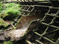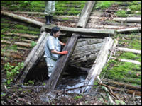 この特異な環境を巧みに利用したものが「鉄砲堰」です。鉄砲堰は源流域で伐採された木材を運び出す方法のひとつです。木組みのダムを設け、水をいっきに放流することで木材を下流に押し流します。