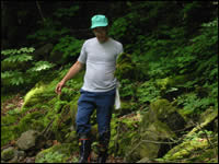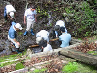 ●中津川型の特徴 大滝村にいつ頃伝わったのかは不明で、大正時代に静岡県大井川の井川地域と交流があったことから、この時期に秋田式と越中式の両方が導入されたと考えるのが自然だろう。但し、本来の秋田式と越中式と比較すると異なっており、基本的には両者の構造を継承しながら融合した独自のスタイルが見られる。 ■2003年7月13日(土) 3年前に再築されたという鉄砲堰を再現するために、民宿「中津荘」山中氏の指導の下、貯水作業を行った。 先ず、大坊主(長い板)を中央に立てかける(写真1)。これを中心として左右対称にベラ板(鉄砲板)を横にしてはめ込み、上流からの水をブロックする。(写真2) 板は下から順に積み上げていく。このとき板と板の隙間から水が漏れてくるのを塞ぐための苔を採取するとよい。(写真3) はじめは面白いように水が貯まっていく。水位が上がるにつれて心が躍る。ちょろちょろと流れ出る渓の音とコマドリの鳴き声だけが聞こえる。静寂の中、堰は着々と水のエネルギーを貯めこんでいく。この力が一度に開放されたときの破壊力たるやいかなるものかと想像するだけで興奮してくる。人間はモノを作る動物だが、破壊することにも喜びを感じてしまうのだと思った。童心のいたずら心が刺激されるからだろう。(写真4)