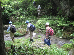 埼玉インストラクター会の植生調査研修が6月12日(日)に、ときがわ町の森林インストラクターの森(仁志の森)で行われました。研修には埼玉森林インストラクター会会員17名とオブザーバー1名の18名が参加しました。研修場所の森林インストラクターの森へは、写真1に示したように山からの清流を渡って行きました。川の水が大変きれいで、大切にされている森林だと感じました。