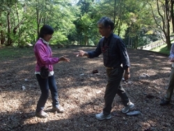 おなかもいっぱいになったところで黛さんの指導の基、最終テーマ「フィールドでのエコクイズ」を行いました。 二人一組となり、地図を頼りに山中に設けられたポイントを廻り、全部で20問の森林や自然に関するクイズを解いていきます。 クイズの一例を揚げれば「日本の国土に占める森林面積の割合は世界で何番目か」といった具合です。 子供でも分かる簡単なものから、普段から林業や森林に関心を持っていないと分らないようなものまで多岐に富んだ設問でした。 朝からずっと立っていたせいもあり、山の中を歩くのはそれなりに疲れもしましたが、1時間半程度で全員やりとげました。 全員が揃ったところで黛さんが回答を説明し、皆で答え合わせを行いました。 黛さん曰く、森林インストラクターとしては正答率70%以上が望ましいとのことでしたが、全員が70%以上をクリアしていました。
