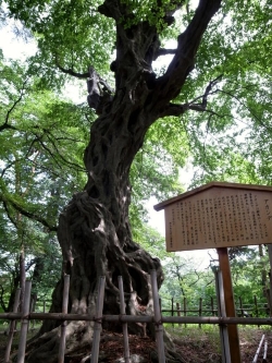 全体的に樹皮が畝状に隆起し、骨が浮き出ているような奇観を呈している古木かつ奇木。