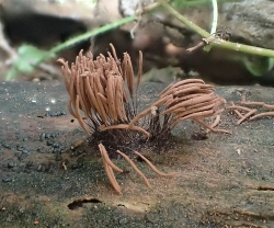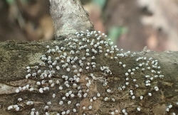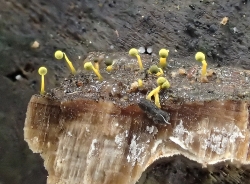 この後、参加者各自が持参した菓子箱とルーペを持って森の中へ繰り出すが、 粘菌同好会メンバーの手助けなくしては中々見つけられない。ほかならぬ私も「これだ!」と採取しようとすると、 「これはカビ」、「それはキノコ」との指導を受け何やら情け無いありさまであったが、 同好会の皆さんの丁寧なアドバイスにより、ようやく何種かをゲットすることができた。