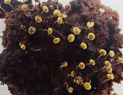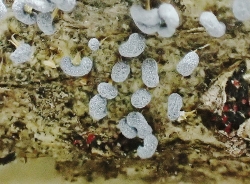机上に持ち帰り、吉田講師の同定によってヤニホコリ、ムラサキホコリ、クラカタホコリを始めとして約20種を確認し、 その一つ一つを顕微鏡で覗き込み、時には美しく、時には奇妙な姿カタチを堪能させて頂いたが、 最後に見たソラマメホコリはこの名、付けも付けたり、ソラマメそっくりの姿にはビックリした。